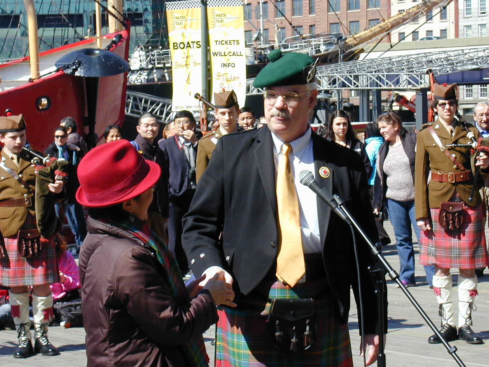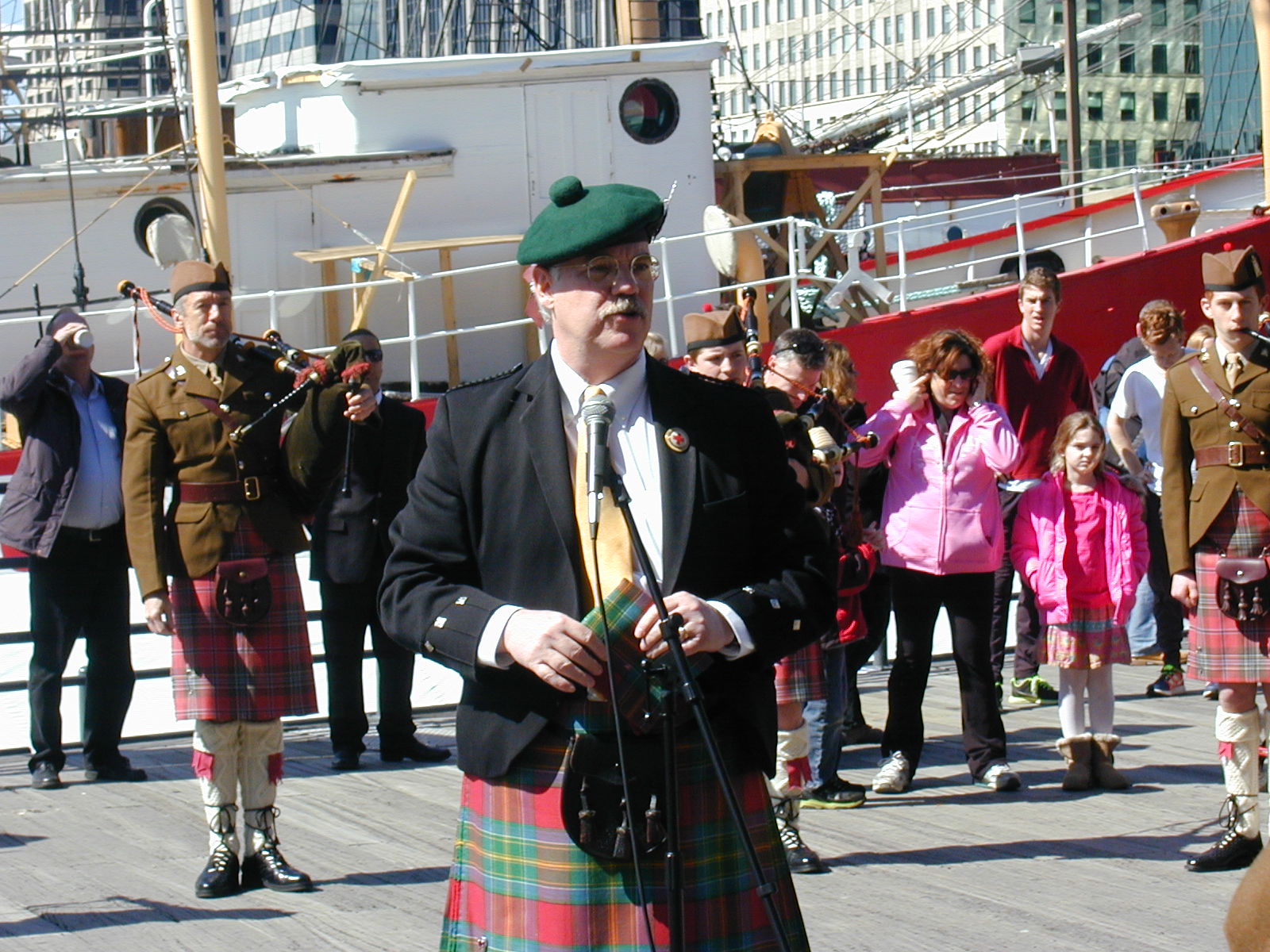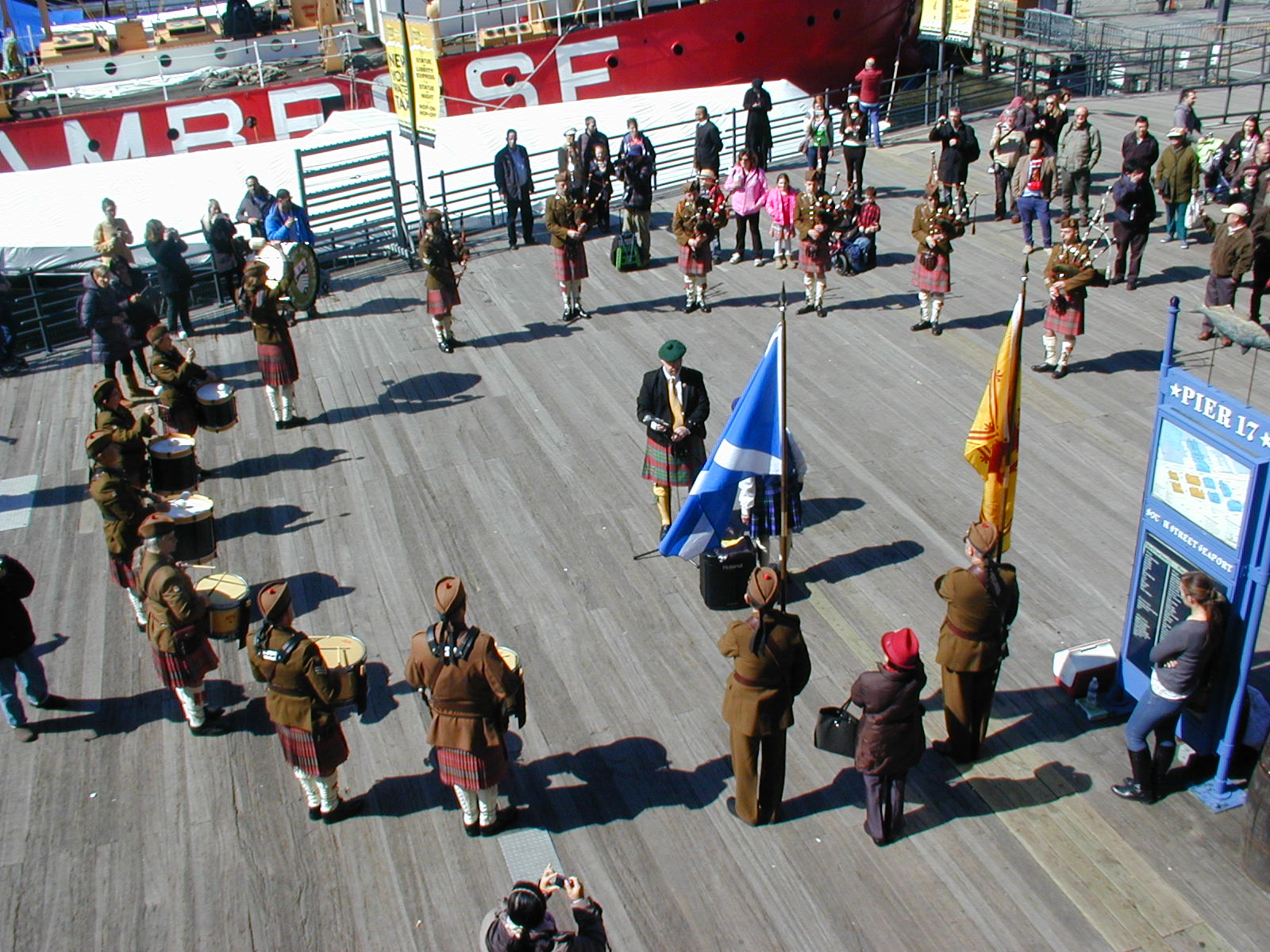 And so, on a warm and sunny Saturday one day before Easter, on the pier outside of Pier 17, that Robert Currie FSA Scot appeared before a crowd of people to welcome them to the day's festivities. He introduced the first of the performances, The Rampant Lion Pipe Band from Basking Ridge New Jersey